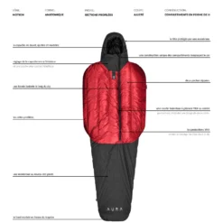 Le X 300/800 d’Aura est un sac de couchage qui se démarque par sa forme et sa conception. Il a été conçu spécialement pour l’escalade et l’alpinisme, pour des bivouacs en conditions difficiles. Sa forme anatomique ajustée résulte d’une conception prenant le moins de place possible au bivouac, d’une recherche de confort aussi bien allongé que assis, sans perdre en isolation. Pour cela, il dispose sur les côtés au niveau du torse, de panneaux latéraux qui augmentent la thermicité.