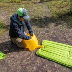 Le Ultra 5R Mummy est dotĂ© deux valves plates qui ne dĂ©passent pas du matelas, une pour le gonflage avec clapet anti-retour et une pour le dĂ©gonflage. Il est vendu avec le sac-pompe Schnozzel Pumpbag UL pour faciliter le gonflage et Ă©viter d’envoyer de l’air humide dans la structure du matelas.
