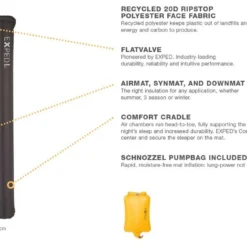 - Légèreté : les matériaux utilisés (polyester 20 deniers recylcé) permettent à Exped de proposer un matelas très léger : 620 grammes, ce qui est une performance au regard du confort qu’il procure et des performances thermiques.