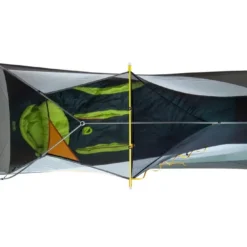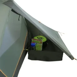 La tente est de couleur sombre et sans réflecteur de lumière (hormis les cordelettes des sardines) pour un bivouac discret, même au bord d’une route. Un bac en tissu de 60 grammes (fournie avec la tente), permet de ranger son équipement au sec dans l’abside. Plusieurs sangles de fixation sont placées au-dessus de la porte, afin de suspendre des vêtements pour les faire sécher durant la nuit.