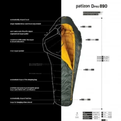 Le Dpro 890 de la marque tchèque Patizon est un sac de couchage à utiliser en 3 ou 4 saisons suivant sa frilosité. Il est garni avec 890 grammes de duvet de canard européen hypoallergénique de 700 cuin+, 90/10, certifié RDS. La répartition de celui-ci est homogène, 50% sur le dessus, 50% sur le dessous. L’enveloppe du sac de couchage est confectionnée avec des chambres en Z afin de garantir une isolation optimale. Grâce à cela, il affiche une température de confort de -9°C.
