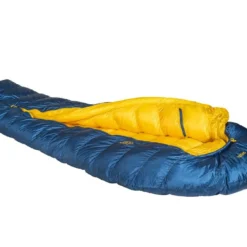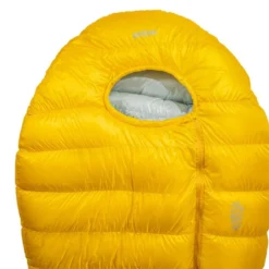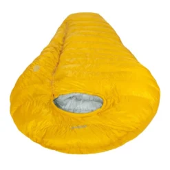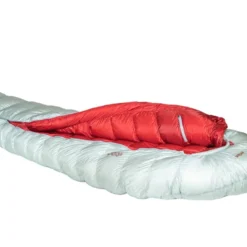 Le G800 est confectionné avec un tissu léger en Pertex Quantum Ripstop DWR, traité contre l’humidité. Sa fermeture éclair semi-automatique de 3 millimètres à deux particularités. Elle remonte sur le dessus permet de la trouver plus facilement dans le noir et d’obtenir une construction plus anatomique au niveau des épaules. Le zip est muni d’un bloqueur, une fois celui-ci enclenché, il ne coulisse plus. Pour protéger le duvet de l’humidité expirez pendant la nuit, le pourtour du visage dispose d’une isolation en fibre synthétique Climashield. Elle ajoute par la même occasion un confort supplémentaire au niveau du cordon de la capuche.