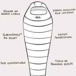 Le tissu l’Ascent 500 est un Pertex Quantum doux au toucher, déperlant et coupe-vent. Les cloisons en forme de trapèze limitent au maximum les déperditions. Sa forme momie et son espace coudé pour les pieds le rendent très spacieux pour son poids.