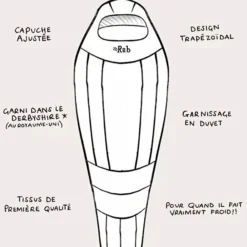 Le sac de couchage Expedition 1000 de Rab dispose d’un duvet d’oie d’excellente qualité. Il contient 1 kg de duvet d’oie européen hydrophobe certifié RDS de 850 cuin. La marque ne communique pas de température de confort pour ses sacs de couchage grand froid, mais de notre expérience, celle-ci est d’environ -16/-18°C. Sa coupe légèrement surdimensionnée par rapport à d’autre modèle de la marque, permet d’utiliser le sac de couchage avec des vêtements d’expédition volumineux.
