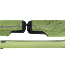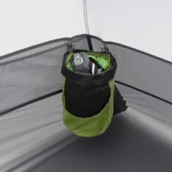 La housse de rangement se décompose en plusieurs compartiments, afin de pouvoir séparer la chambre du double-toit lorsque celui-ci est ranger encore humide. Elle a été pensée pour servir de poches de rangement dans la tente et de « lightbar » plafonnière (à combiner avec sa lampe).