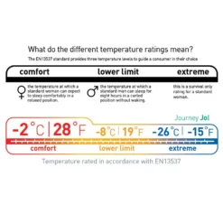 Grâce aux caractéristiques techniques, le Journey JOI offre une température confort de -2°C ce qui est performant au regard du volume et du poids total du sac de couchage.
