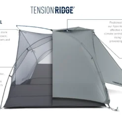La tente dispose d’une aération haute, au niveau de l’arceau Tension Ridge et d’une ventilation basse par le dessous des portes extérieures. Ce système assure une ventilation optimum pour éliminer au maximum le risque de condensation. Ses ventilations peuvent être ouvertes ou fermés pour s’adapter suivant les conditions météo.