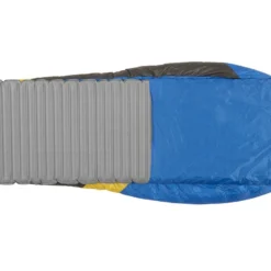 Le fourreau en tissu situé dans le dos permet d’insérer un matelas. Ce dispositif évite de glisser sur le sol pendant la nuit. Sur cette partie, le sac de couchage ne contient pas de duvet, afin d’économiser sur le poids final. C’est le matelas qui assure l’isolation pour bloquer le froid qui remonte du sol. Au niveau des pieds, une ouverture permet une ventilation par le bas lors des nuitées les plus chaudes.