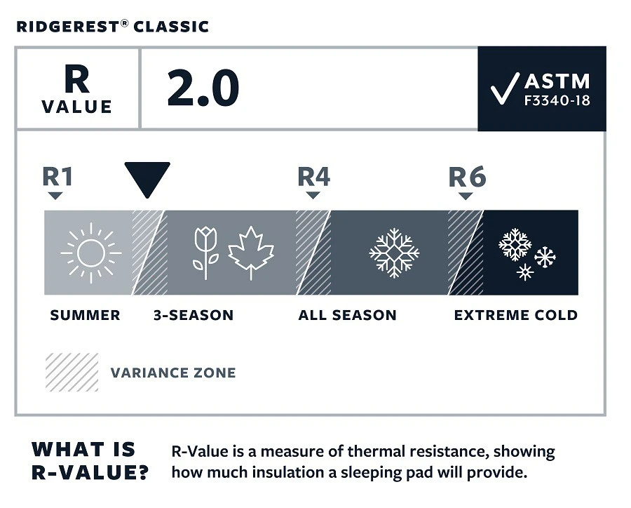 Le RidgRest Classic de Thermarest est un matelas léger en mousse à alvéoles fermées conçu pour un usage 2 saisons. La conception technique offre 2 caractéristiques :